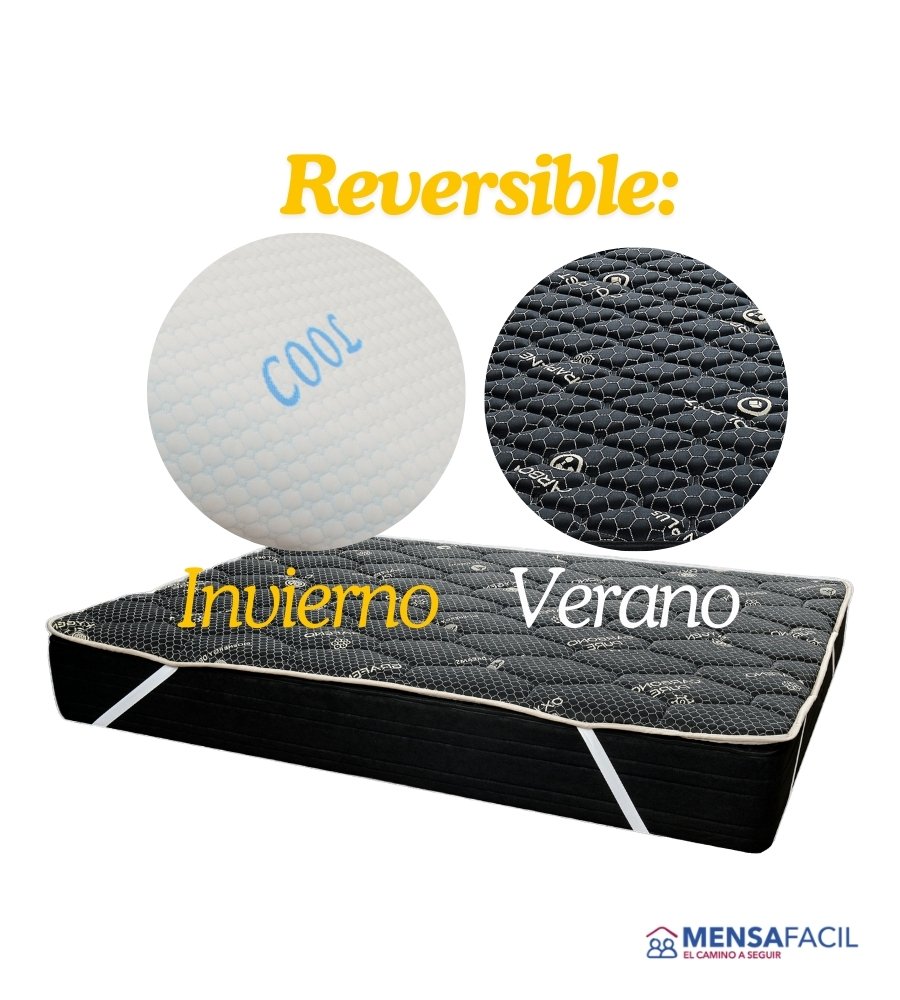 El Topper Black Cool ha sido diseñado con una estructura reversible de doble cara, que se adapta a las necesidades de cada época del año. Su cara de invierno incorpora un tejido cálido y envolvente que conserva la temperatura corporal para ofrecer un descanso confortable en los meses fríos. En contraste, la cara de verano está confeccionada con hilo frío de última generación, capaz de reducir la sensación térmica entre 6 y 8 °C, proporcionando frescor continuo incluso en climas cálidos o en personas con alta sudoración. Gracias a este sistema versátil, el topper asegura un confort constante y personalizado durante todo el año, garantizando un descanso más saludable, equilibrado y reparador.